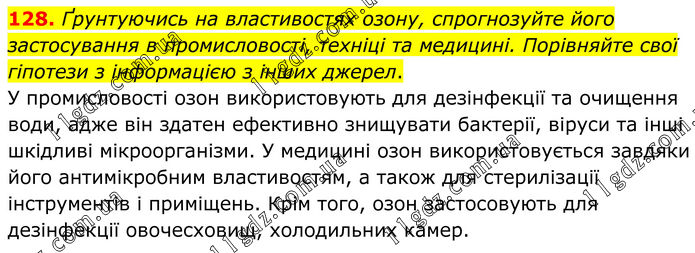 128. Ґрунтуючись на властивостях озону, спрогнозуйте його застосування в промисловості, техніці та медицині. Порівняйте свої гіпотези з інформацією з інших джерел. У промисловості озон використовують для дезінфекції та очищення води, адже він здатен ефективно знищувати бактерії, віруси та інші шкідливі мікроорганізми. У медицині озон використовується завдяки його антимікробним властивостям, а також для стерилізації інструментів і приміщень. Крім того, озон застосовують для дезінфекції овочесховищ, холодильних камер.