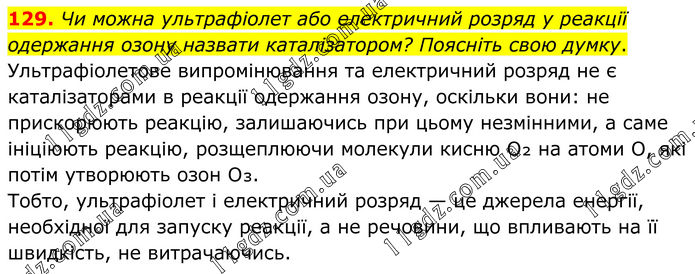 129. Чи можна ультрафіолет або електричний розряд у реакції одержання озону назвати каталізатором? Поясніть свою думку. Ультрафіолетове випромінювання та електричний розряд не є каталізаторами в реакції одержання озону, оскільки вони: не прискорюють реакцію, залишаючись при цьому незмінними, а саме ініціюють реакцію, розщеплюючи молекули кисню O₂ на атоми О, які потім утворюють озон O₃. Тобто, ультрафіолет і електричний розряд — це джерела енергії, необхідної для запуску реакції, а не речовини, що впливають на її швидкість, не витрачаючись.