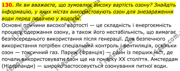 130. Як ви вважаєте, що зумовлює високу вартість озону? Знайдіть інформацію, у яких містах використовують озон для знезараження води перед подачею у водогін. Основні причини високої вартості — це складність і енергоємність процесу одержання озону, а також його нестабільність, що вимагає безпосереднього використання після генерації. Для безпечного використання потрібен спеціальний контроль і вентиляція, оскільки озон — токсичний газ. Париж (Франція) — один із перших міст, де почали використовувати озон ще на початку XX століття. Амстердам (Нідерланди) — широко застосовується озонування питної води.