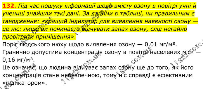 132. Під час пошуку інформації щодо вмісту озону в повітрі учні й учениці знайшли такі дані. За даними в таблиці, чи правильним є твердження: «кращий індикатор для виявлення наявності озону — це ніс: лише ви починаєте відчувати запах озону, слід негайно провітрити приміщення». Поріг людського нюху щодо виявлення озону — 0,01 мг/м³. Гранично допустима концентрація озону в повітрі населених міст — 0,16 мг/м³. Це означає, що людина відчуває запах озону ще до того, як його концентрація стане небезпечною, тому ніс справді є ефективним «індикатором».