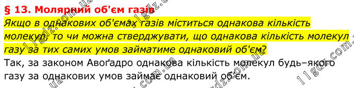 § 13. Молярний об'єм газів Якщо в однакових об'ємах газів міститься однакова кількість молекул, то чи можна стверджувати, що однакова кількість молекул газу за тих самих умов займатиме однаковий об'єм? Так, за законом Авоґадро однакова кількість молекул будь–якого газу за однакових умов займає однаковий об’єм.