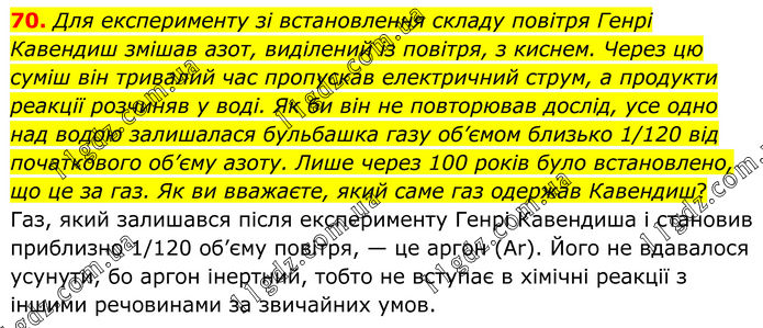 70. Для експерименту зі встановлення складу повітря Генрі Кавендиш змішав азот, виділений із повітря, з киснем. Через цю суміш він тривалий час пропускав електричний струм, а продукти реакції розчиняв у воді. Як би він не повторював дослід, усе одно над водою залишалася бульбашка газу об’ємом близько 1/120 від початкового об’єму азоту. Лише через 100 років було встановлено, що це за газ. Як ви вважаєте, який саме газ одержав Кавендиш? Газ, який залишався після експерименту Генрі Кавендиша і становив приблизно 1/120 об’єму повітря, — це аргон (Ar). Його не вдавалося усунути, бо аргон інертний, тобто не вступає в хімічні реакції з іншими речовинами за звичайних умов.