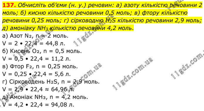 137. Обчисліть об’єми (н. у.) речовин: а) азоту кількістю речовини 2 моль; б) кисню кількістю речовини 0,5 моль; в) фтору кількістю речовини 0,25 моль; г) сірководню H2S кількістю речовини 2,9 моль; д) амоніаку NH3 кількістю речовини 4,2 моль. а) Азот N₂, n = 2 моль. V = 2 • 22,4 = 44,8 л. б) Кисень O₂, n = 0,5 моль. V = 0,5 • 22,4 = 11,2 л. в) Фтор F₂, n = 0,25 моль. V = 0,25 • 22,4 = 5,6 л. г) Сірководень H₂S, n = 2,9 моль. V = 2,9 • 22,4 ≈ 64,96 л. д) Амоніак NH₃, n = 4,2 моль. V = 4,2 • 22,4 = 94,08 л.