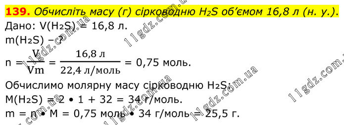 139. Обчисліть масу (г) сірководню H2S об’ємом 16,8 л (н. у.). Дано: V(H₂S) = 16,8 л. m(H₂S) – ? n = V/Vm = (16,8 л)/(22,4 л/моль) = 0,75 моль. Обчислимо молярну масу сірководню H₂S: М(H₂S) = 2 • 1 + 32 = 34 г/моль. m = n • M = 0,75 моль • 34 г/моль = 25,5 г.