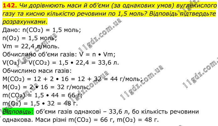 142. Чи дорівнюють маси й об’єми (за однакових умов) вуглекислого газу та кисню кількістю речовини по 1,5 моль? Відповідь підтвердьте розрахунками. Дано: n(CO₂) = 1,5 моль; n(O₂) = 1,5 моль; Vm = 22,4 л/моль. Обчислимо об’єми газів: V = n • Vm; V(O₂) = V(CO₂) = 1,5 • 22,4 = 33,6 л. Обчислимо маси газів: М(CO₂) = 12 + 2 • 16 = 12 + 32 = 44 г/моль; М(O₂) = 2 • 16 = 32 г/моль. m(CO₂) = 1,5 • 44 = 66 г; m(O₂) = 1,5 • 32 = 48 г. Відповідь: об’єми газів однакові – 33,6 л, бо кількість речовини однакова. Маси різні m(CO₂) = 66 г, m(O₂) = 48 г.