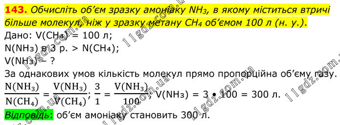 143. Обчисліть об’єм зразку амоніаку NH3, в якому міститься втричі більше молекул, ніж у зразку метану CH4 об’ємом 100 л (н. у.). Дано: V(CH₄) = 100 л; N(NH₃) в 3 р. > N(CH₄); V(NH₃) – ? За однакових умов кількість молекул прямо пропорційна об’єму газу. (N(NH₃))/(N(CH₄)) = (V(NH₃))/(V(CH₄)); 3/1 = (V(NH₃))/100; V(NH₃) = 3 • 100 = 300 л. Відповідь: об’єм амоніаку становить 300 л.