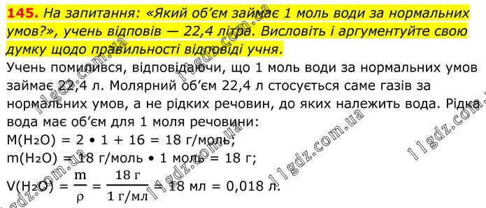 145. На запитання: «Який об’єм займає 1 моль води за нормальних умов?», учень відповів — 22,4 літра. Висловіть і аргументуйте свою думку щодо правильності відповіді учня. Учень помилився, відповідаючи, що 1 моль води за нормальних умов займає 22,4 л. Молярний об’єм 22,4 л стосується саме газів за нормальних умов, а не рідких речовин, до яких належить вода. Рідка вода має об’єм для 1 моля речовини: M(H₂O) = 2 • 1 + 16 = 18 г/моль; m(H₂O) = 18 г/моль • 1 моль = 18 г; V(H₂O) = m/ρ = (18 г)/(1 г/мл) = 18 мл = 0,018 л.