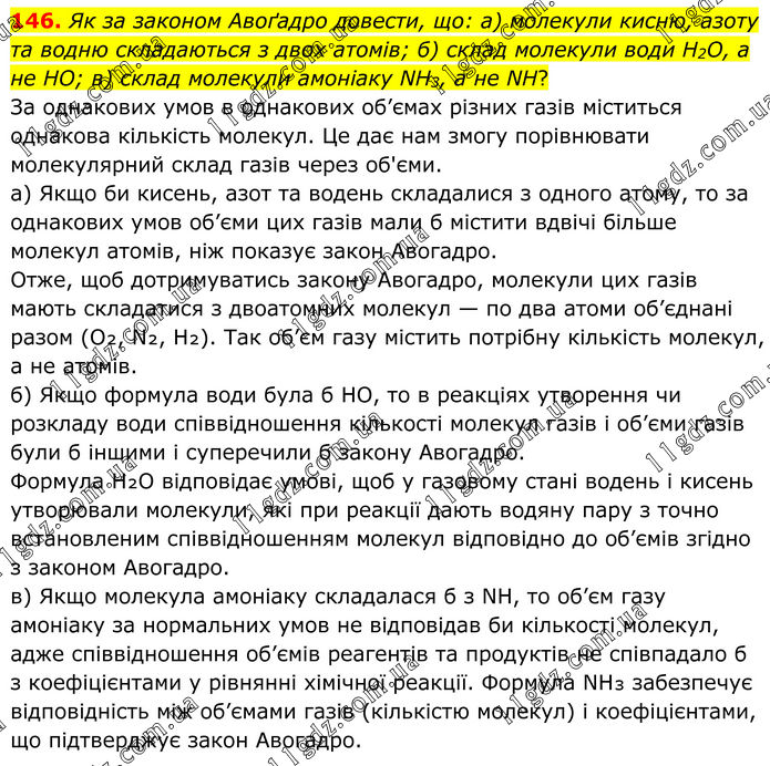 146. Як за законом Авоґадро довести, що: а) молекули кисню, азоту та водню складаються з двох атомів; б) склад молекули води H2O, а не HO; в) склад молекули амоніаку NH3, а не NH? За однакових умов в однакових об’ємах різних газів міститься однакова кількість молекул. Це дає нам змогу порівнювати молекулярний склад газів через об'єми. а) Якщо би кисень, азот та водень складалися з одного атому, то за однакових умов об’єми цих газів мали б містити вдвічі більше молекул атомів, ніж показує закон Авогадро. Отже, щоб дотримуватись закону Авогадро, молекули цих газів мають складатися з двоатомних молекул — по два атоми об’єднані разом (O₂, N₂, H₂). Так об’єм газу містить потрібну кількість молекул, а не атомів. б) Якщо формула води була б HO, то в реакціях утворення чи розкладу води співвідношення кількості молекул газів і об’єми газів були б іншими і суперечили б закону Авогадро. Формула H₂O відповідає умові, щоб у газовому стані водень і кисень утворювали молекули, які при реакції дають водяну пару з точно встановленим співвідношенням молекул відповідно до об’ємів згідно з законом Авогадро. в) Якщо молекула амоніаку складалася б з NH, то об’єм газу амоніаку за нормальних умов не відповідав би кількості молекул, адже співвідношення об’ємів реагентів та продуктів не співпадало б з коефіцієнтами у рівнянні хімічної реакції. Формула NH₃ забезпечує відповідність між об’ємами газів (кількістю молекул) і коефіцієнтами, що підтверджує закон Авогадро.