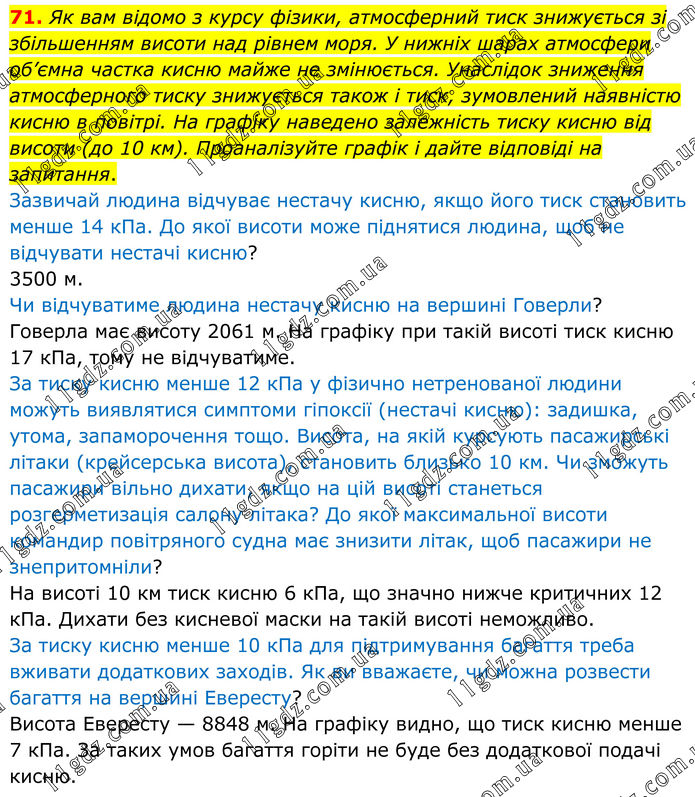 71. Як вам відомо з курсу фізики, атмосферний тиск знижується зі збільшенням висоти над рівнем моря. У нижніх шарах атмосфери об’ємна частка кисню майже не змінюється. Унаслідок зниження атмосферного тиску знижується також і тиск, зумовлений наявністю кисню в повітрі. На графіку наведено залежність тиску кисню від висоти (до 10 км). Проаналізуйте графік і дайте відповіді на запитання. Зазвичай людина відчуває нестачу кисню, якщо його тиск становить менше 14 кПа. До якої висоти може піднятися людина, щоб не відчувати нестачі кисню? 3500 м. Чи відчуватиме людина нестачу кисню на вершині Говерли? Говерла має висоту 2061 м. На графіку при такій висоті тиск кисню 17 кПа, тому не відчуватиме. За тиску кисню менше 12 кПа у фізично нетренованої людини можуть виявлятися симптоми гіпоксії (нестачі кисню): задишка, утома, запаморочення тощо. Висота, на якій курсують пасажирські літаки (крейсерська висота), становить близько 10 км. Чи зможуть пасажири вільно дихати, якщо на цій висоті станеться розгерметизація салону літака? До якої максимальної висоти командир повітряного судна має знизити літак, щоб пасажири не знепритомніли? На висоті 10 км тиск кисню 6 кПа, що значно нижче критичних 12 кПа. Дихати без кисневої маски на такій висоті неможливо. За тиску кисню менше 10 кПа для підтримування багаття треба вживати додаткових заходів. Як ви вважаєте, чи можна розвести багаття на вершині Евересту? Висота Евересту — 8848 м. На графіку видно, що тиск кисню менше 7 кПа. За таких умов багаття горіти не буде без додаткової подачі кисню.