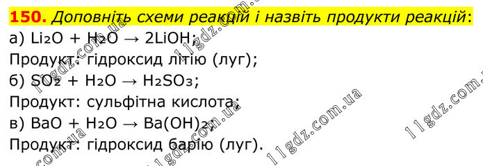 150. Доповніть схеми реакцій і назвіть продукти реакцій: а) Li₂O + H₂O → 2LiOH; Продукт: гідроксид літію (луг); б) SO₂ + H₂O → H₂SO₃; Продукт: сульфітна кислота; в) BaO + H₂O → Ba(OH)₂; Продукт: гідроксид барію (луг).