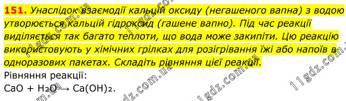 151. Унаслідок взаємодії кальцій оксиду (негашеного вапна) з водою утворюється кальцій гідроксид (гашене вапно). Під час реакції виділяється так багато теплоти, що вода може закипіти. Цю реакцію використовують у хімічних грілках для розігрівання їжі або напоїв в одноразових пакетах. Складіть рівняння цієї реакції. Рівняння реакції: CaO + H₂O → Ca(OH)₂.
