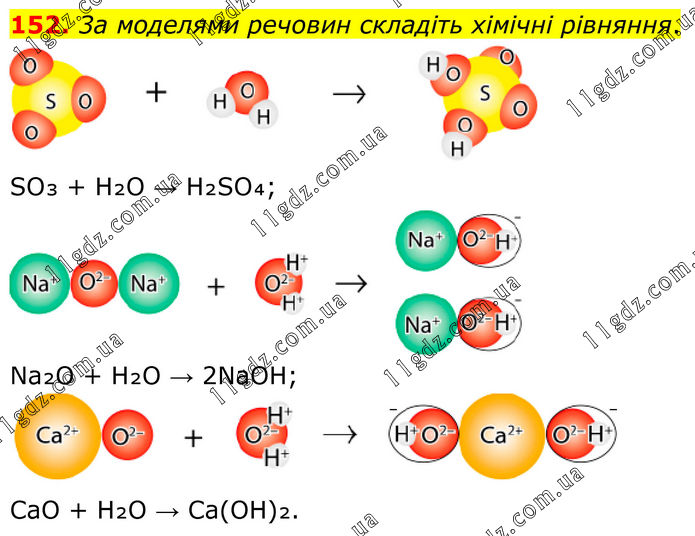152. 3а моделями речовин складіть хімічні рівняння. SO₃ + H₂O → H₂SO₄; Na₂O + H₂O → 2NaOH; CaO + H₂O → Ca(OH)₂.