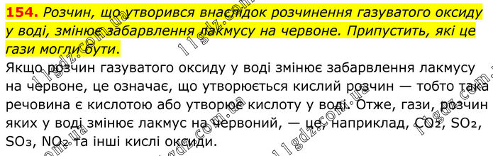 154. Розчин, що утворився внаслідок розчинення газуватого оксиду у воді, змінює забарвлення лакмусу на червоне. Припустить, які це гази могли бути. Якщо розчин газуватого оксиду у воді змінює забарвлення лакмусу на червоне, це означає, що утворюється кислий розчин — тобто така речовина є кислотою або утворює кислоту у воді. Отже, гази, розчин яких у воді змінює лакмус на червоний, — це, наприклад, CO₂, SO₂, SO₃, NO₂ та інші кислі оксиди.