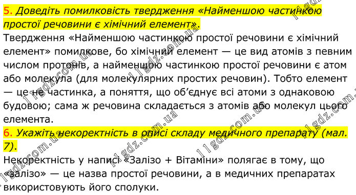 5. Доведіть помилковість твердження «Найменшою частинкою простої речовини є хімічний елемент». Твердження «Найменшою частинкою простої речовини є хімічний елемент» помилкове, бо хімічний елемент — це вид атомів з певним числом протонів, а найменшою частинкою простої речовини є атом або молекула (для молекулярних простих речовин). Тобто елемент — це не частинка, а поняття, що об’єднує всі атоми з однаковою будовою; сама ж речовина складається з атомів або молекул цього елемента. 6. Укажіть некоректність в описі складу медичного препарату (мал. 7). Некоректність у написі «Залізо + Вітаміни» полягає в тому, що «залізо» — це назва простої речовини, а в медичних препаратах використовують його сполуки.
