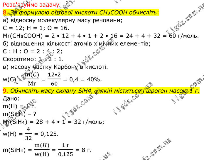 Розв'язуймо задачу 8. За формулою оцтової кислоти CH₃COOH обчисліть: а) відносну молекулярну масу речовини; C = 12; H = 1; O = 16. Mr(CH₃COOH) = 2 • 12 + 4 • 1 + 2 • 16 = 24 + 4 + 32 = 60 г/моль. б) відношення кількості атомів хімічних елементів; C : H : O = 2 : 4 : 2; Скоротимо: 1 : 2 : 1. в) масову частку Карбону в кислоті. w(C) = (m(C))/Mr = (12•2)/60 = 0,4 = 40%. 9. Обчисліть масу силану SiH4, у якій міститься Гідроген масою 1 г. Дано: m(H) = 1 г. m(SiH₄) – ? Mr(SiH₄) = 28 + 4 • 1 = 32 г/моль; w(Н) = 4/32 = 0,125. m(SiH₄) = (m(H))/(w(H)) = (1 г)/0,125 = 8 г.