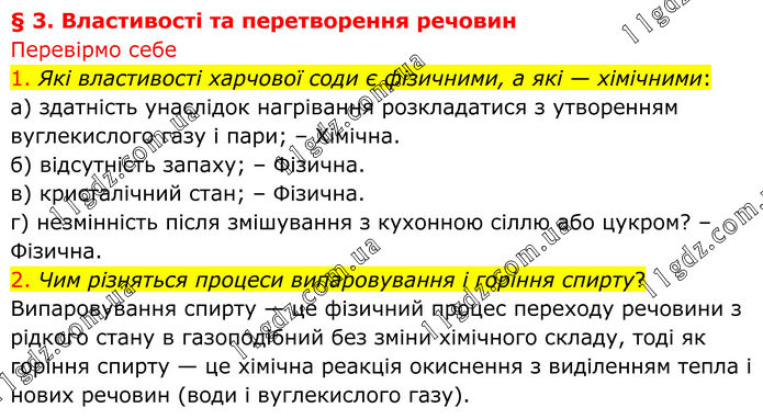 Перевірмо себе 1. Які властивості харчової соди є фізичними, а які — хімічними: а) здатність унаслідок нагрівання розкладатися з утворенням вуглекислого газу і пари; – Хімічна. б) відсутність запаху; – Фізична. в) кристалічний стан; – Фізична. г) незмінність після змішування з кухонною сіллю або цукром? – Фізична. 2. Чим різняться процеси випаровування і горіння спирту? Випаровування спирту — це фізичний процес переходу речовини з рідкого стану в газоподібний без зміни хімічного складу, тоді як горіння спирту — це хімічна реакція окиснення з виділенням тепла і нових речовин (води і вуглекислого газу).