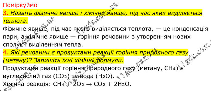 Поміркуймо 3. Назвіть фізичне явище і хімічне явище, під час яких виділяється теплота. Фізичне явище, під час якого виділяється теплота, — це конденсація пари, а хімічне явище — горіння речовини з утворенням нових сполук і виділенням тепла. 4. Які речовини є продуктами реакції горіння природного газу (метану)? Запишіть їхні хімічні формули. Продуктами реакції горіння природного газу (метану, CH₄) є вуглекислий газ (CO₂) та вода (H₂O). Хімічна реакція: CH₄ + 2O₂ → CO₂ + 2H₂O.