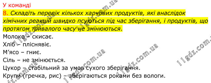 У команді 8. Складіть перелік кількох харчових продуктів, які внаслідок хімічних реакцій швидко псуються під час зберігання, і продуктів, що протягом тривалого часу не змінюються. Молоко – скисає. Хліб – пліснявіє. М’ясо – гниє. Сіль – не змінюється. Цукор – стабільний за умов сухого зберігання. Крупи (гречка, рис) – зберігаються роками без вологи.