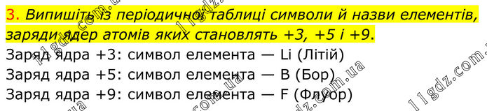 3. Випишіть із періодичної таблиці символи й назви елементів, заряди ядер атомів яких становлять +3, +5 і +9. Заряд ядра +3: символ елемента — Li (Літій) Заряд ядра +5: символ елемента — B (Бор) Заряд ядра +9: символ елемента — F (Флуор)