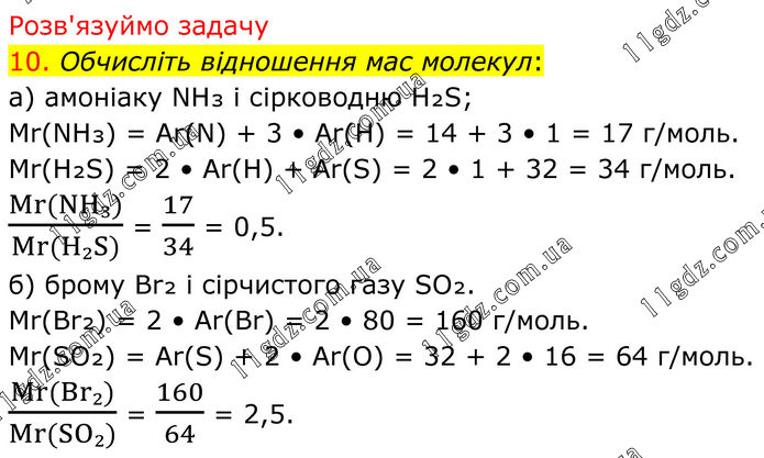 Розв'язуймо задачу 10. Обчисліть відношення мас молекул: а) амоніаку NH₃ і сірководню H₂S; Mr(NH₃) = Ar(N) + 3 • Ar(H) = 14 + 3 • 1 = 17 г/моль. Mr(H₂S) = 2 • Ar(H) + Ar(S) = 2 • 1 + 32 = 34 г/моль. (Mr(NH₃))/(Mr(H₂S)) = 17/34 = 0,5. б) брому Br₂ і сірчистого газу SO₂. Mr(Br₂) = 2 • Ar(Br) = 2 • 80 = 160 г/моль. Мr(SO₂) = Ar(S) + 2 • Ar(O) = 32 + 2 • 16 = 64 г/моль. (Mr(Br₂))/(Mr(SO₂)) = 160/64 = 2,5.