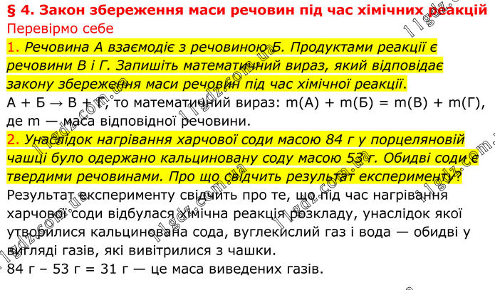 Перевірмо себе 1. Речовина А взаємодіє з речовиною Б. Продуктами реакції є речовини В і Г. Запишіть математичний вираз, який відповідає закону збереження маси речовин під час хімічної реакції. A + Б → В + Г, то математичний вираз: m(A) + m(Б) = m(В) + m(Г), де m — маса відповідної речовини. 2. Унаслідок нагрівання харчової соди масою 84 г у порцеляновій чашці було одержано кальциновану соду масою 53 г. Обидві соди є твердими речовинами. Про що свідчить результат експерименту? Результат експерименту свідчить про те, що під час нагрівання харчової соди відбулася хімічна реакція розкладу, унаслідок якої утворилися кальцинована сода, вуглекислий газ і вода — обидві у вигляді газів, які вивітрилися з чашки. 84 г – 53 г = 31 г — це маса виведених газів.