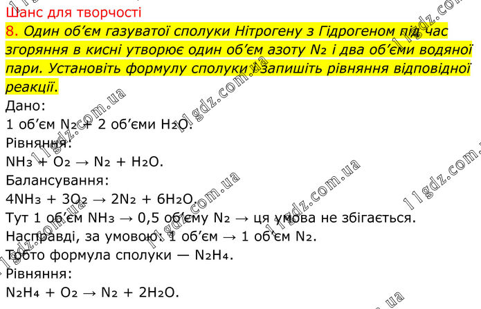 Шанс для творчості 8. Один об’єм газуватої сполуки Нітрогену з Гідрогеном під час згоряння в кисні утворює один об’єм азоту N₂ і два об’єми водяної пари. Установіть формулу сполуки і запишіть рівняння відповідної реакції. Дано: 1 об’єм N₂ + 2 об’єми H₂O. Рівняння: NH₃ + O₂ → N₂ + H₂O. Балансування: 4NH₃ + 3O₂ → 2N₂ + 6H₂O. Тут 1 об’єм NH₃ → 0,5 об’єму N₂ → ця умова не збігається. Насправді, за умовою: 1 об’єм → 1 об’єм N₂. Тобто формула сполуки — N₂H₄. Рівняння: N₂H₄ + O₂ → N₂ + 2H₂O.