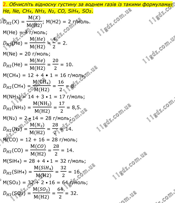 2. Обчисліть відносну густину за воднем газів із такими формулами: He, Ne, CH₄, NH₃, N₂, CO, SiH₄, SO₂. D_H2(X) = (M(X))/(M(H2)); M(H2) = 2 г/моль. M(He) = 4 г/моль; D_H2(He) = (M(He))/(M(H2)) = 4/2 = 2. M(Ne) = 20 г/моль; D_H2(He) = (M(Ne))/(M(H2)) = 20/2 = 10. M(CH₄) = 12 + 4 • 1 = 16 г/моль; D_H2(CH₄) = (M(CH₄))/(M(H2)) = 16/2 = 8. M(NH₃) = 14 + 3 • 1 = 17 г/моль; D_H2(NH₃) = (M(NH₃))/(M(H2)) = 17/2 = 8,5. M(N₂) = 2 • 14 = 28 г/моль; D_H2(N₂) = (M(N₂))/(M(H2)) = 28/2 = 14. M(CO) = 12 + 16 = 28 г/моль; D_H2(CO) = (M(CO))/(M(H2)) = 28/2 = 14. M(SiH₄) = 28 + 4 • 1 = 32 г/моль; D_H2(SiH₄) = (M(SiH₄))/(M(H2)) = 32/2 = 16. M(SO₂) = 32 + 2 • 16 = 64 г/моль; D_H2(SO₂) = (M(SO₂))/(M(H2)) = 64/2 = 32.