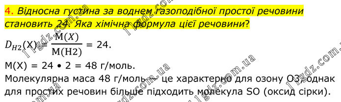 4. Відносна густина за воднем газоподібної простої речовини становить 24. Яка хімічна формула цієї речовини? D_H2(X) = (M(X))/(M(H2)) = 24. М(Х) = 24 • 2 = 48 г/моль. Молекулярна маса 48 г/моль — це характерно для озону O3, однак для простих речовин більше підходить молекула SO (оксид сірки).