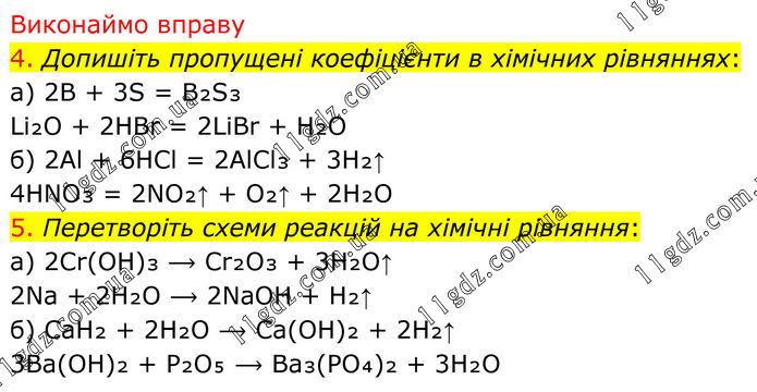 Виконаймо вправу 4. Допишіть пропущені коефіцієнти в хімічних рівняннях: а) 2B + 3S = B₂S₃ Li₂O + 2HBr = 2LiBr + H₂O б) 2Al + 6HCl = 2AlCl₃ + 3H₂↑ 4HNO₃ = 2NO₂↑ + O₂↑ + 2H₂O 5. Перетворіть схеми реакцій на хімічні рівняння: а) 2Cr(OH)₃ ⟶ Cr₂O₃ + 3H₂O↑ 2Na + 2H₂O ⟶ 2NaOH + H₂↑ б) CaH₂ + 2H₂O ⟶ Ca(OH)₂ + 2H₂↑ 3Ba(OH)₂ + P₂O₅ ⟶ Ba₃(PO₄)₂ + 3H₂O