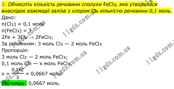 2. Обчисліть кількість речовини сполуки FeCl₃, яка утворилася внаслідок взаємодії заліза з хлором Cl₂ кількістю речовини 0,1 моль. Дано: n(Cl₂) = 0,1 моль n(FeCl₃) = ? 2Fe + 3Cl₂ → 2FeCl₃; За рівнянням: 3 моль Cl₂ — 2 моль FeCl₃. Пропорція: 3 моль Cl₂ — 2 моль FeCl₃; 0,1 моль Cl₂ — x моль FeCl₃. x = (0,1•2)/3 = 0,0667 моль. Відповідь: 0,0667 моль.