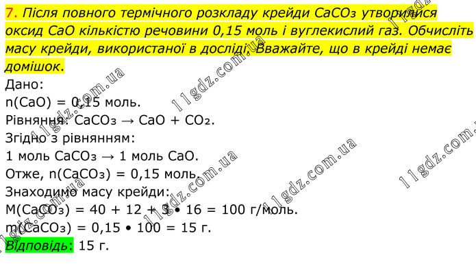 7. Після повного термічного розкладу крейди CaCO₃ утворилися оксид CaO кількістю речовини 0,15 моль і вуглекислий газ. Обчисліть масу крейди, використаної в досліді. Вважайте, що в крейді немає домішок. Дано: n(CaO) = 0,15 моль. Рівняння: CaCO₃ → CaO + CO₂. Згідно з рівнянням: 1 моль CaCO₃ → 1 моль CaO. Отже, n(CaCO₃) = 0,15 моль. Знаходимо масу крейди: M(CaCO₃) = 40 + 12 + 3 • 16 = 100 г/моль. m(CaCO₃) = 0,15 • 100 = 15 г. Відповідь: 15 г.