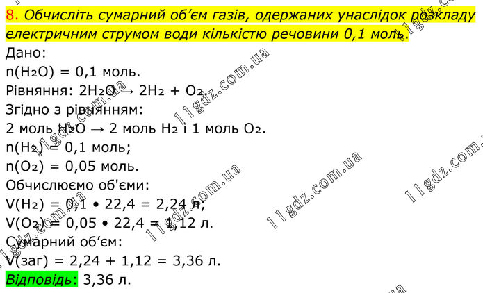 8. Обчисліть сумарний об’єм газів, одержаних унаслідок розкладу електричним струмом води кількістю речовини 0,1 моль. Дано: n(H₂O) = 0,1 моль. Рівняння: 2H₂O → 2H₂ + O₂. Згідно з рівнянням: 2 моль H₂O → 2 моль H₂ і 1 моль O₂. n(H₂) = 0,1 моль; n(O₂) = 0,05 моль. Обчислюємо об'єми: V(H₂) = 0,1 • 22,4 = 2,24 л; V(O₂) = 0,05 • 22,4 = 1,12 л. Сумарний об’єм: V(заг) = 2,24 + 1,12 = 3,36 л. Відповідь: 3,36 л.