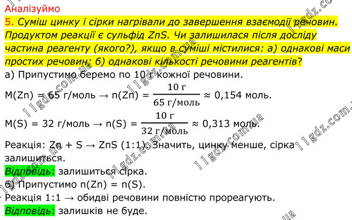 Аналізуймо 5. Суміш цинку і сірки нагрівали до завершення взаємодії речовин. Продуктом реакції є сульфід ZnS. Чи залишилася після досліду частина реагенту (якого?), якщо в суміші містилися: а) однакові маси простих речовин; б) однакові кількості речовини реагентів? а) Припустимо беремо по 10 г кожної речовини. M(Zn) = 65 г/моль → n(Zn) = (10 г)/(65 г/моль) ≈ 0,154 моль. M(S) = 32 г/моль → n(S) = (10 г)/(32 г/моль) ≈ 0,313 моль. Реакція: Zn + S → ZnS (1:1). Значить, цинку менше, сірка залишиться. Відповідь: залишиться сірка. б) Припустимо n(Zn) = n(S). Реакція 1:1 → обидві речовини повністю прореагують. Відповідь: залишків не буде.