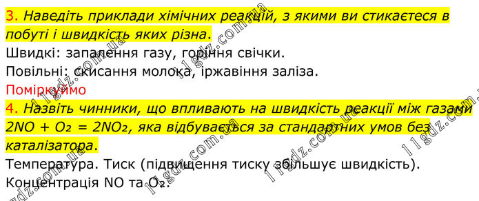 3. Наведіть приклади хімічних реакцій, з якими ви стикаєтеся в побуті і швидкість яких різна. Швидкі: запалення газу, горіння свічки. Повільні: скисання молока, іржавіння заліза. Поміркуймо 4. Назвіть чинники, що впливають на швидкість реакції між газами 2NО + O₂ = 2NO₂, яка відбувається за стандартних умов без каталізатора. Температура. Тиск (підвищення тиску збільшує швидкість). Концентрація NO та O₂.