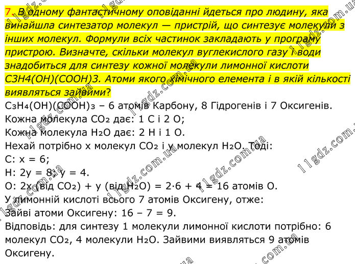 7. В одному фантастичному оповіданні йдеться про людину, яка винайшла синтезатор молекул — пристрій, що синтезує молекули з інших молекул. Формули всіх частинок закладають у програму пристрою. Визначте, скільки молекул вуглекислого газу і води знадобиться для синтезу кожної молекули лимонної кислоти C3H4(OH)(COOH)3. Атоми якого хімічного елемента і в якій кількості виявляться зайвими? C₃H₄(OH)(COOH)₃ – 6 атомів Карбону, 8 Гідрогенів і 7 Оксигенів. Кожна молекула CO₂ дає: 1 C і 2 O; Кожна молекула H₂O дає: 2 H і 1 O. Нехай потрібно x молекул CO₂ і y молекул H₂O. Тоді: C: x = 6; H: 2y = 8; y = 4. O: 2x (від CO₂) + y (від H₂O) = 2·6 + 4 = 16 атомів O. У лимонній кислоті всього 7 атомів Оксигену, отже: Зайві атоми Оксигену: 16 – 7 = 9. Відповідь: для синтезу 1 молекули лимонної кислоти потрібно: 6 молекул CO₂, 4 молекули H₂O. Зайвими виявляться 9 атомів Оксигену.