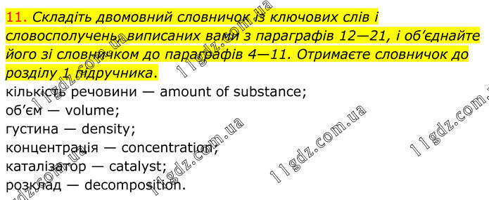 11. Складіть двомовний словничок із ключових слів і словосполучень, виписаних вами з параграфів 12—21, і об’єднайте його зі словничком до параграфів 4—11. Отримаєте словничок до розділу 1 підручника. кількість речовини — amount of substance; об’єм — volume; густина — density; концентрація — concentration; каталізатор — catalyst; розклад — decomposition.