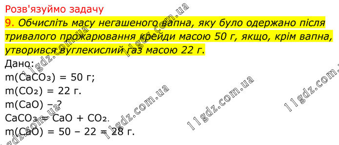 Розв'язуймо задачу 9. Обчисліть масу негашеного вапна, яку було одержано після тривалого прожарювання крейди масою 50 г, якщо, крім вапна, утворився вуглекислий газ масою 22 г. Дано: m(CaCO₃) = 50 г; m(CO₂) = 22 г. m(CaO) – ? CaCO₃ = CaO + CO₂. m(CaO) = 50 – 22 = 28 г.