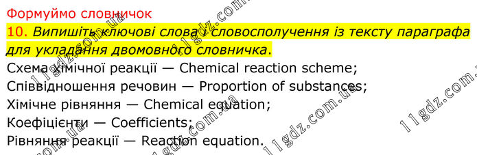 Формуймо словничок 10. Випишіть ключові слова і словосполучення із тексту параграфа для укладання двомовного словничка. Схема хімічної реакції — Chemical reaction scheme; Співвідношення речовин — Proportion of substances; Хімічне рівняння — Chemical equation; Коефіцієнти — Coefficients; Рівняння реакції — Reaction equation.