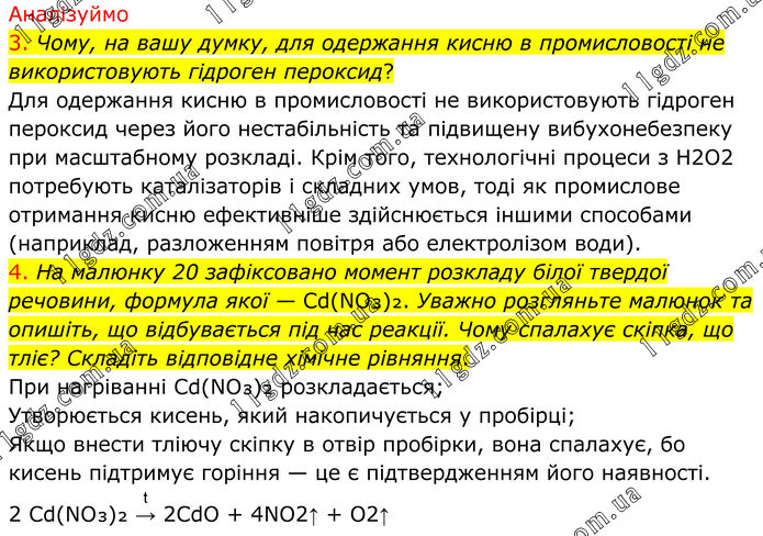 Аналізуймо 3. Чому, на вашу думку, для одержання кисню в промисловості не використовують гідроген пероксид? Для одержання кисню в промисловості не використовують гідроген пероксид через його нестабільність та підвищену вибухонебезпеку при масштабному розкладі. Крім того, технологічні процеси з H2O2 потребують каталізаторів і складних умов, тоді як промислове отримання кисню ефективніше здійснюється іншими способами (наприклад, разложенням повітря або електролізом води). 4. На малюнку 20 зафіксовано момент розкладу білої твердої речовини, формула якої — Cd(NO₃)₂. Уважно розгляньте малюнок та опишіть, що відбувається під час реакції. Чому спалахує скіпка, що тліє? Складіть відповідне хімічне рівняння. При нагріванні Cd(NO₃)₂ розкладається; Утворюється кисень, який накопичується у пробірці; Якщо внести тліючу скіпку в отвір пробірки, вона спалахує, бо кисень підтримує горіння — це є підтвердженням його наявності. 2 Cd(NO₃)₂ →(t) 2CdO + 4NO2↑ + O2↑
