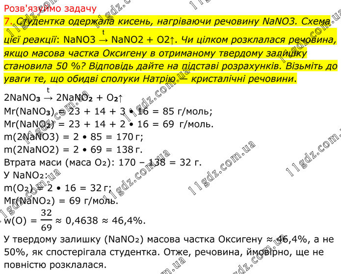 Розв'язуймо задачу 7. Студентка одержала кисень, нагріваючи речовину NaNO3. Схема цієї реакції: NaNO3 →(t) NaNO2 + O2↑. Чи цілком розклалася речовина, якщо масова частка Оксигену в отриманому твердому залишку становила 50 %? Відповідь дайте на підставі розрахунків. Візьміть до уваги те, що обидві сполуки Натрію — кристалічні речовини. 2NaNO3 →(t) 2NaNO2 + O2↑ Mr(NaNO3) = 23 + 14 + 3 • 16 = 85 г/моль; Mr(NaNO2) = 23 + 14 + 2 • 16 = 69 г/моль. m(2NaNO3) = 2 • 85 = 170 г; m(2NaNO2) = 2 • 69 = 138 г. Втрата маси (маса O₂): 170 – 138 = 32 г. У NaNO₂: m(O₂) = 2 • 16 = 32 г; Mr(NaNO₂) = 69 г/моль. w(O) = 32/69 ≈ 0,4638 ≈ 46,4%. У твердому залишку (NaNO₂) масова частка Оксигену ≈ 46,4%, а не 50%, як спостерігала студентка. Отже, речовина, ймовірно, ще не повністю розклалася.
