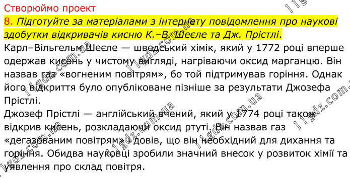 Створюймо проект 8. Підготуйте за матеріалами з інтернету повідомлення про наукові здобутки відкривачів кисню К.–В. Шеєле та Дж. Прістлі. Карл–Вільгельм Шеєле — шведський хімік, який у 1772 році вперше одержав кисень у чистому вигляді, нагріваючи оксид марганцю. Він назвав газ «вогненим повітрям», бо той підтримував горіння. Однак його відкриття було опубліковане пізніше за результати Джозефа Прістлі. Джозеф Прістлі — англійський вчений, який у 1774 році також відкрив кисень, розкладаючи оксид ртуті. Він назвав газ «дегазованим повітрям» і довів, що він необхідний для дихання та горіння. Обидва науковці зробили значний внесок у розвиток хімії та уявлення про склад повітря.