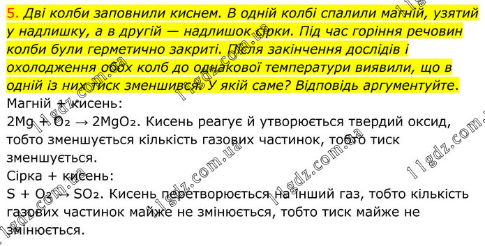 5. Дві колби заповнили киснем. В одній колбі спалили магній, узятий у надлишку, а в другій — надлишок сірки. Під час горіння речовин колби були герметично закриті. Після закінчення дослідів і охолодження обох колб до однакової температури виявили, що в одній із них тиск зменшився. У якій саме? Відповідь аргументуйте. Магній + кисень: 2Mg + O₂ → 2MgO₂. Кисень реагує й утворюється твердий оксид, тобто зменшується кількість газових частинок, тобто тиск зменшується. Сірка + кисень: S + O₂ → SO₂. Кисень перетворюється на інший газ, тобто кількість газових частинок майже не змінюється, тобто тиск майже не змінюється.