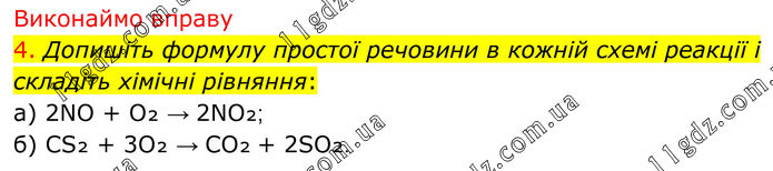Виконаймо вправу 4. Допишіть формулу простої речовини в кожній схемі реакції і складіть хімічні рівняння: а) 2NO + O₂ → 2NO₂; б) CS₂ + 3O₂ → CO₂ + 2SO₂.