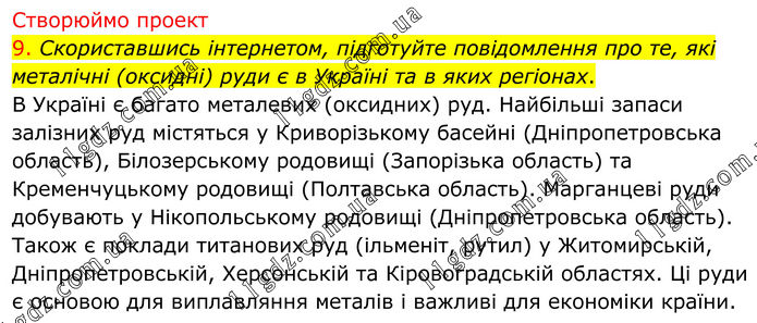 Створюймо проект 9. Скориставшись інтернетом, підготуйте повідомлення про те, які металічні (оксидні) руди є в Україні та в яких регіонах. В Україні є багато металевих (оксидних) руд. Найбільші запаси залізних руд містяться у Криворізькому басейні (Дніпропетровська область), Білозерському родовищі (Запорізька область) та Кременчуцькому родовищі (Полтавська область). Марганцеві руди добувають у Нікопольському родовищі (Дніпропетровська область). Також є поклади титанових руд (ільменіт, рутил) у Житомирській, Дніпропетровській, Херсонській та Кіровоградській областях. Ці руди є основою для виплавляння металів і важливі для економіки країни.