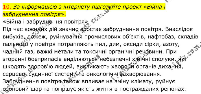 10. За інформацією з інтернету підготуйте проект «Війна і забруднення повітря». «Війна і забруднення повітря» Під час воєнних дій значно зростає забруднення повітря. Внаслідок вибухів, пожеж, руйнування промислових об’єктів, нафтобаз, складів пального у повітря потрапляють пил, дим, оксиди сірки, азоту, чадний газ, важкі метали та токсичні органічні речовини. При згоранні боєприпасів виділяються небезпечні хімічні сполуки, які шкодять здоров'ю людей, викликають хвороби органів дихання, серцево–судинної системи та онкологічні захворювання. Забруднення повітря також впливає на зміну клімату, руйнує озоновий шар та погіршує якість життя в постраждалих регіонах.