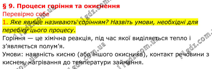 § 9. Процеси горіння та окиснення Перевірмо себе 1. Яке явище називають горінням? Назвіть умови, необхідні для перебігу цього процесу. Горіння — це хімічна реакція, під час якої виділяється тепло і з’являється полум’я. Умови: наявність кисню (або іншого окисника), контакт речовини з киснем, нагрівання до температури займання.