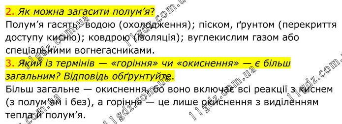 2. Як можна загасити полум’я? Полум’я гасять: водою (охолодження); піском, ґрунтом (перекриття доступу кисню); ковдрою (ізоляція); вуглекислим газом або спеціальними вогнегасниками. 3. Який із термінів — «горіння» чи «окиснення» — є більш загальним? Відповідь обґрунтуйте. Більш загальне — окиснення, бо воно включає всі реакції з киснем (з полум’ям і без), а горіння — це лише окиснення з виділенням тепла й полум’я.