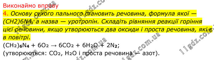 Виконаймо вправу 4. Основу сухого пального становить речовина, формула якої — (CH2)6N4, а назва — уротропін. Складіть рівняння реакції горіння цієї речовини, якщо утворюються два оксиди і проста речовина, які є в повітрі. (CH₂)6N4 + 6O₂ → 6CO₂ + 6H₂O + 2N2; (утворюються: CO₂, H₂O і проста речовина — азот).