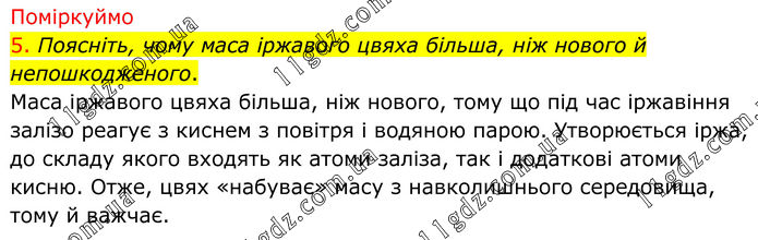 Поміркуймо 5. Поясніть, чому маса іржавого цвяха більша, ніж нового й непошкодженого. Маса іржавого цвяха більша, ніж нового, тому що під час іржавіння залізо реагує з киснем з повітря і водяною парою. Утворюється іржа, до складу якого входять як атоми заліза, так і додаткові атоми кисню. Отже, цвях «набуває» масу з навколишнього середовища, тому й важчає.