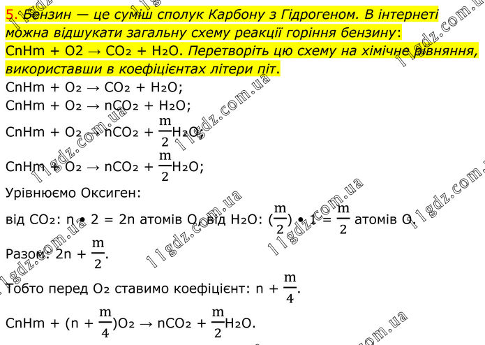 5. Бензин — це суміш сполук Карбону з Гідрогеном. В інтернеті можна відшукати загальну схему реакції горіння бензину: CnHm + O2 → CO₂ + H₂O. Перетворіть цю схему на хімічне рівняння, використавши в коефіцієнтах літери піт. CnHm + O₂ → CO₂ + H₂O; CnHm + O₂ → nCO₂ + H₂O; CnHm + O₂ → nCO₂ + m/2H₂O; CnHm + O₂ → nCO₂ + m/2H₂O; Урівнюємо Оксиген: від CO₂: n • 2 = 2n атомів O, від H₂O: (m/2) • 1 = m/2 атомів O. Разом: 2n + m/2. Тобто перед O₂ ставимо коефіцієнт: n + m/4. CnHm + (n + m/4)O₂ → nCO₂ + m/2H₂O.